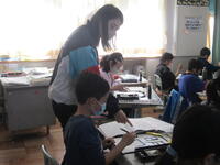 5年生算数の授業は体積を求める問題を解いています。縦3ḿ、横50㎝、高さ2ḿの立方体の体積を求めていますが、2つの方法があるようです。ḿに単位を合わせて計算する方法と㎝に単位を合わせて計算する方法です。答えを出した後の単位の付け方にも気を付けています。