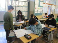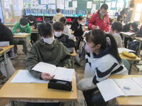 6年生算数の授業の様子です。算数の復習として、教科書の総まとめの問題に取り組んでいます。自力で解いたり、友達に聞いたりし、最後は先生に確認してもらっています。中学生に向け、苦手分野を克服しておきたいですね。