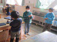 1年生生活の授業は、昔の遊びに取り組んでいます。コマ回しやけん玉、ビー玉落としに挑戦している子が多いようです。今日は、遊び方の説明と実際の演技について、友達同士で動画を撮影しています。分かりやすい説明と解説を一生懸命に話していました。