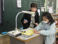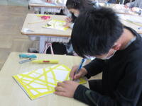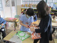 3年生図工の授業は、デザインした絵を切り抜いて切り絵を作成しています。どこから切り抜き、どこを切り抜くかを先生が説明しています。丁寧な作業で安全に注意しながら集中して絵を切り抜いています。