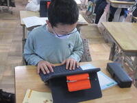 2年生国語の授業は、「何があったのかな?」の単元です。3枚の場面絵のうち最初と最後に2枚には絵が描かれていますが、真ん中の2枚目は空白です。1枚目と3枚目の絵を比較して何が違うかを比べて、2枚目の絵を想像しています。そして、2枚目の絵の物語を作っていきます。