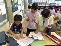 1年生が小学校初めての夏休みを前に、夏休みに読む本を2冊ずつ借りました。自分の興味のある本を一生懸命探す1年生です。貸し出し手続きのやり方もしっかり身に付いてきました。貸し出し手続きが終わると、さっそく本を読み始めている1年生でした。この2冊の本は、夏休みが終わって登校した際に返却手続きを行います。