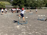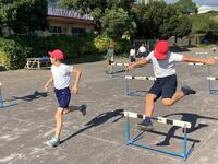 6年生の体育の授業の様子です。ハードル走に取り組んでいます。今日は、跳ぶときの空中姿勢について、確認していました。抜く足を横に引き上げてなるべく低くハードルを跳ぶようにしていきます。子供たちも空中姿勢を意識することで、フォームがきれいになっていきました。
