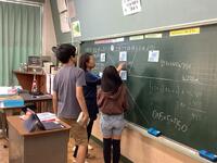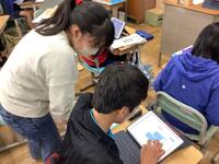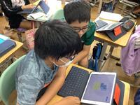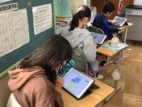 5年生の外国語の授業の様子です。1人1台端末に配布された地図をもとに、「Where is the ~?」と尋ねられたら、「Go straight for 2 blocks.」「Turn left.」などと答え、相手を道案内する内容に取り組んでいました。子供たちは、2人組となって、相互に道案内の練習をしていきました。多くの友だちと繰り返し練習することによって、道案内も上手にできるようになっていきました。