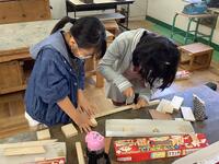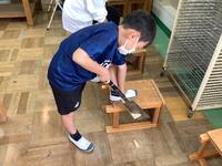 4年生の図画工作の授業の様子です。板をノコギリで切ったり、釘を打ってつないだりして、つくりたいものをつくる活動に取り組んでいます。学習したノコギリで板を切る方法をしっかり実践している4年生です。切っていくうちに、だんだん手つきもよくなってきました。