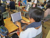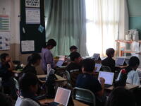 5年生の家庭科授業では、ミシンを使用したエプロンの制作に取り組んでいます。この活動で初めてミシンに触る子も多く、友達同士で助け合いながら作業を進めています。ミシンの操作に慣れ、スムーズに縫えるようになった子も多く、困っている友達のサポートを積極的に行っていました。