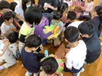「花をさかせよう」ゲームのあとは、2年生からアサガオの種、3年生からはびゅんびゅんごまをプレゼントをしました。