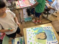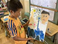 4年生の図画工作の授業の様子です。描いた自画像とこれまでに学んだ絵の具を使った技法を組み合わせたり、背景を描いたりして、作品に仕上げていました。