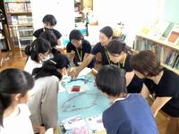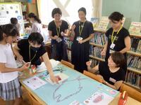 また、今日は、読み聞かせの後、図書室用に「スイミー」の掲示物を作成していただきました。作成した消しゴムスタンプをつかって、「スイミー」の世界を表しています。20分休みには子供たちも参加しました。図書室にすてきな掲示が増えていきます。