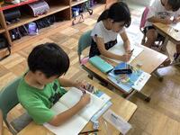 子供たちは、コンパスを使ってとても楽しそうに円をかいていました。大きな円の中に少しずつ小さな円をたくさんかいてみたり、様々な大きさの円で動物の顔を表現してみたりするなど、工夫をしていました。