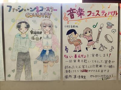 開催が来週に迫った山田っ子学習祭に向けて、各学級や学年のお店のポスターが職員室前に掲示されています。