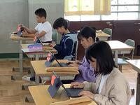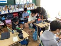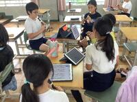 グループごとに分かれての話合いです。計画段階のようです。タブレットを媒介にして話し合う、この光景も今ならではですね。しかし、タブレット上にアイデアはありますが、最後は話合いで解決。これが、今の学びのスタイルです。