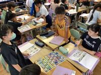 5年生「外国語(英語)」の様子です。自分の行動についての表現方法について学んでいました。中学校英語でいうと現在進行形でしょうか。すごろくをし、止まったところの絵を見て、表現です。みんな英語で自分の行動を話していました。