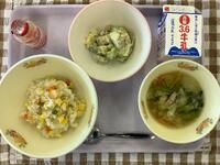☆コーンピラフ☆牛乳☆さつまいもとだいずのサラダ☆野菜スープ☆乳酸菌飲料