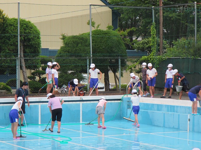 昨日まで、快晴で暑いくらいの天気でしたが、今日は曇り空で水に入るには、寒いくらいの日になってしまいました。8ヶ月間使われなかった施設ですが、6年生によりプール、更衣室、トイレなど隅々まで掃除され、きれいなプールに戻りました。今月末にはプール開きが行われます。1日でも多く、プールが使える天気になってもらいたいものです。