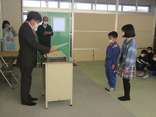 各学年代表児童が修了証や進級祝いを受け取りました。