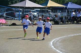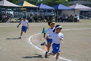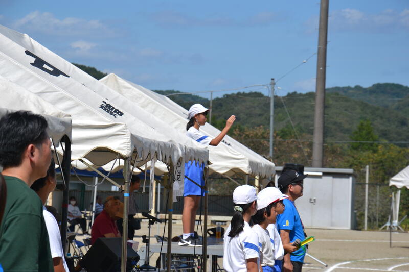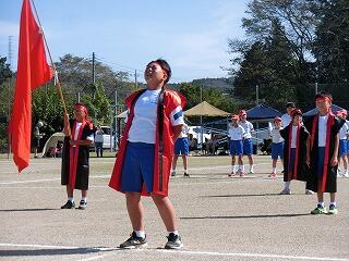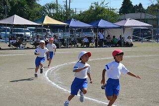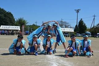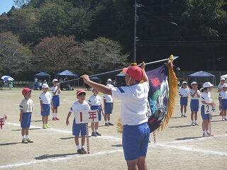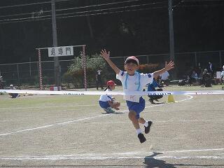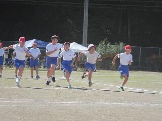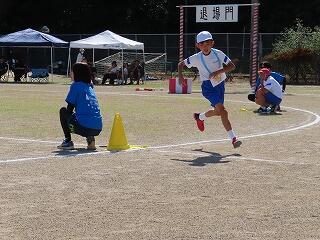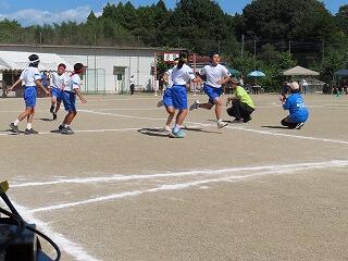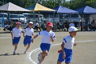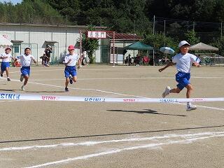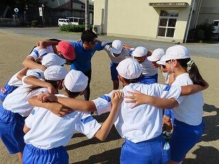9月25日 全校リレーの練習の前、高学年の児童が2年生のはちまきをしばってあげていました。