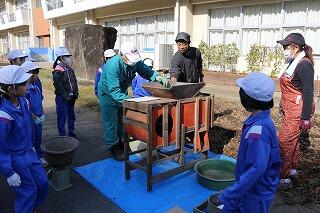 11月7日 3,4年生が大豆の収穫をしました。ブルーシートの上で、乾燥させた大豆を竹の棒で叩いて収穫作業をしました。ふるいにかけたり「唐箕(とうみ)」という、風の力を利用して大豆と枝葉を選別する農具を利用する作業も行いました。