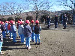 ◦ その後、前庭に移動し、消防署職員の皆様に指導を受けながら、6年生が水消火器による消火体験をしました。