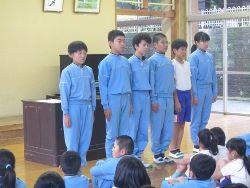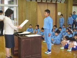 表彰では、歯と口の健康週間作品・町陸上記録会・芳賀地区陸上記録会等の表彰があり、たくさんの児童が表彰を受けました。その後陸上の県大会に出場する6名の選手の壮行会があり、校長先生のお話の後一人ずつ抱負を述べました。