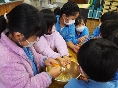 学級園で育てたトウモロコシの粒をみんなで丁寧にとりました。