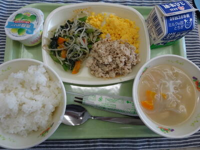 三色ご飯 牛乳 つみれ汁 青梅ゼリー