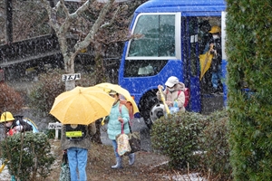 今日は朝から、みぞれまじりの天気です。朝のあいさつ運動のようすです。