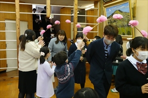 卒業式後、在校生による花のアーチによるお見送りを行いました。あいにくの雨だったので、室内で行いました。卒業生は、親子で在校生の間を歩きました。