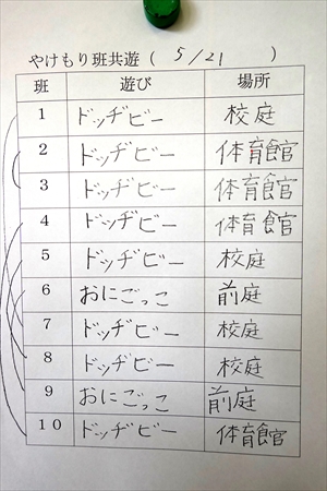 業間(焼森タイム)に予定していた「やけもり班共遊」ですが、雨のため中止となりました。事前に班ごとに相談して、下記の内容で活動する予定でした。残念です。次回を楽しみにしたいと思います。