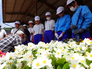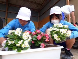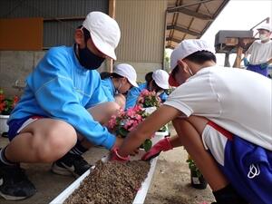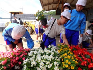 業間から3校時にかけて、5・6年生は、レンタルプランター用の寄せ植え作りをするために、山形園芸に行き作業をしてきました。今年度も、できあがった寄せ植えを学校でしばらく世話をした後、地域でお世話になっている次の5か所に届ける予定です。