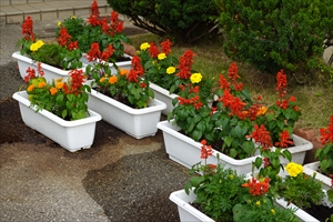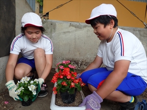 昨日縦割り班ごとに寄せ植えしたプランターを玄関前に移動しました。来校の際は、ご覧ください。