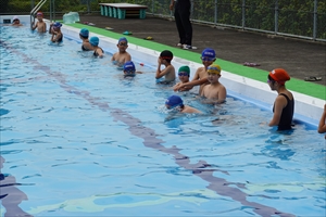 1・2・3年生は、2校時、水泳の授業でした。梅雨の合間のとてもよい天気のもとで行われました。。水の中でジャンケンをしたり、バタ足を練習したりしました。先生の話をよく聞きながら、楽しく学習することができました。学校全体に、子どもたちの元気な声が響き渡りました。