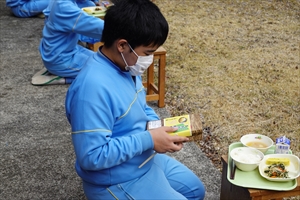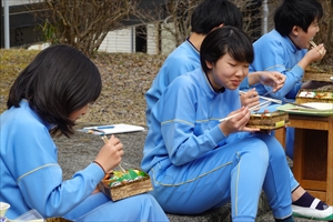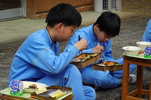 今日の6年生の給食は、卒業のお祝いとして、地域の「いい里さかがわ館」寄贈のお弁当を図工室テラスで食べました。ごちそうさまでした。