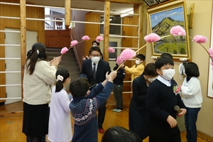 卒業式後、在校生による花のアーチによるお見送りを行いました。あいにくの雨だったので、室内で行いました。卒業生は、親子で在校生の間を歩きました。