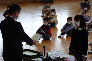 表彰後に、令和3年度修業式を体育館で行いました。いよいよ令和3年度が終わりになります。この1年間で、みんな心も体も大きく成長しました。今までできなかったことが、たくさんできるようになったと思います。4月からは、また新たな目標をもって、新しい学年でがんばってくれることを期待します。進級おめでとうございます。