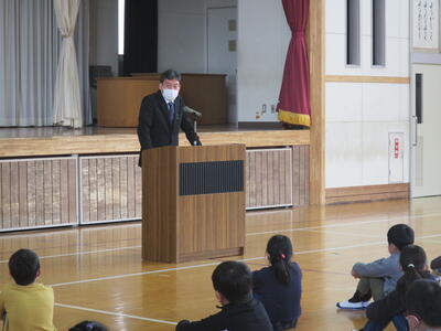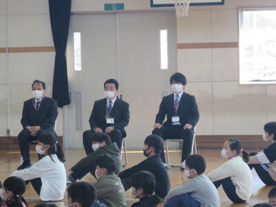 藤野教頭先生をはじめ3名の新しい先生方を児童に紹介しました。