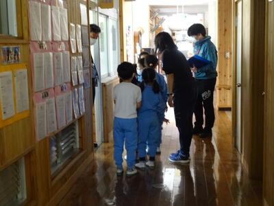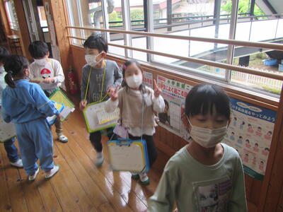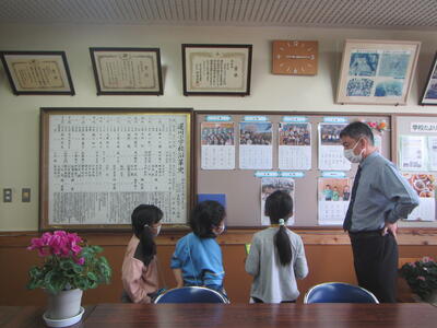 2年生が生活科で、1年生に校舎の中を案内する「学校たんけん」の練習で校長室前を訪れていました。