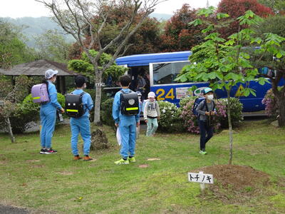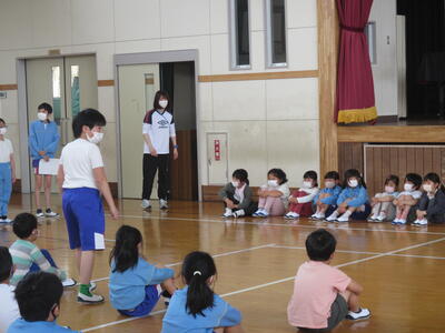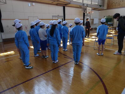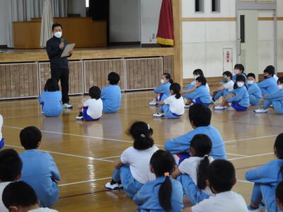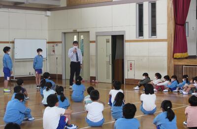 焼森タイムに登校班集会が行われました。1年生が入って、これからも安全に登校できるよう、バスの乗り方などのやくそくを担当の先生と確認しました。