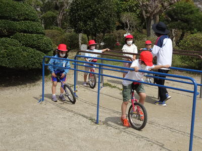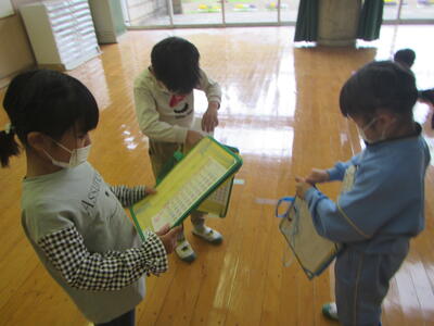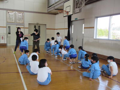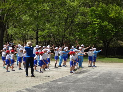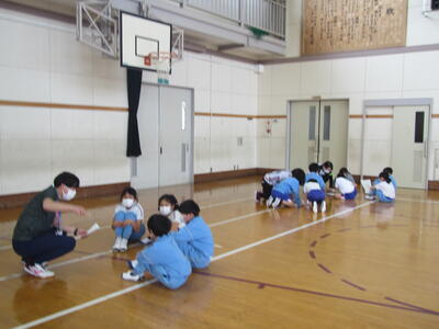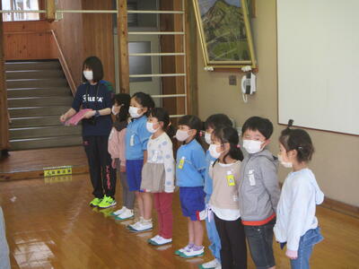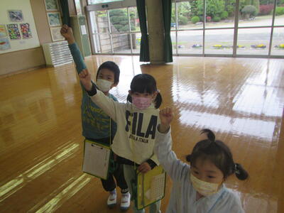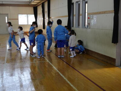 今日の焼森タイムは、体力つくりの時間です。残念ながら雨がふっていたので、集団行動を中心に行いました。