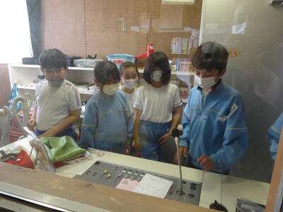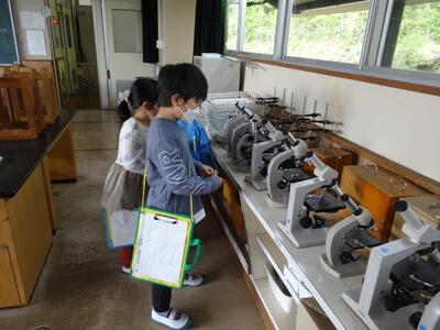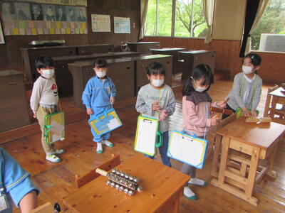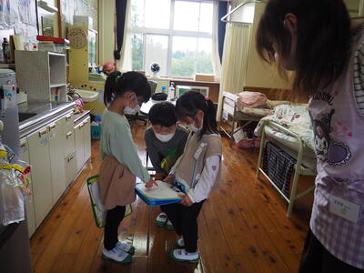 生活科の学習で1・2年生が学校たんけんをしました。班ごとに分かれて、2年生が1年生に学校のいろいろな教室を案内して、いろいろなことを教えていました。2年生のせつめいを1年生もよく聞いていました。