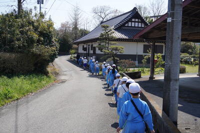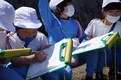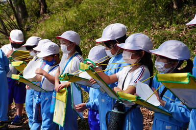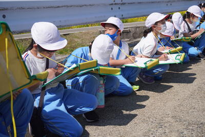 学校のまわりの調べ学習で深沢方面に校外学習に行きました。白地図に見つけたものを書き込み、絵地図づくりをしました。体験を通して地図づくりをすることで、地図について理解を深める活動です。みんながんばって歩き、一生懸命取り組んでいました。