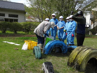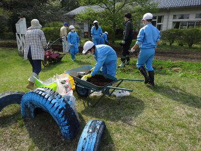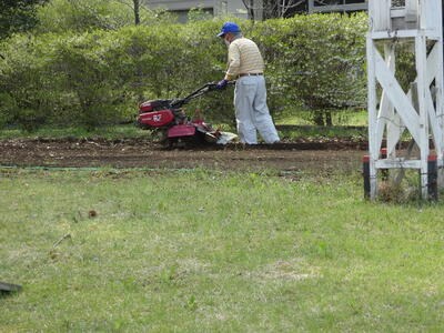 御指導をいただきながら、マルチの上に、昨年度までの農業ボランティア清宮さん御提供の