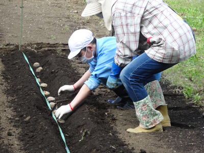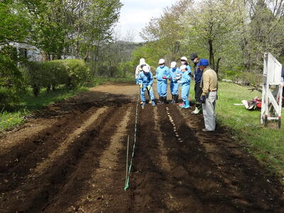 雨で2度、延期になっていたじゃがいも植えが今日はいい天気の中できました。農業ボランティアの方のご指導をいただきながら、種芋を植えていました。ご指導をいただいたので、きっと豊作になるのではないかと思います。じゃがいもは理科の学習でも指導します。農業ボランティアの方には、先週も来てくださり、事前に畑をうなってくださるなど大変お世話になっています。
