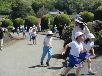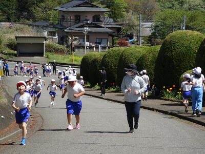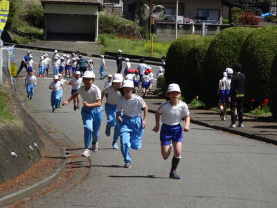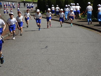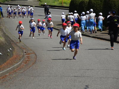 今日の体力つくりは、坂道ダッシュをしました。入り口の坂を使った、逆川小ならではの体力つくりです。1年生も、上級生のお兄さん、お姉さんを見習って、力強く坂道を駆け上がることができました。