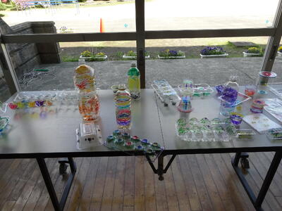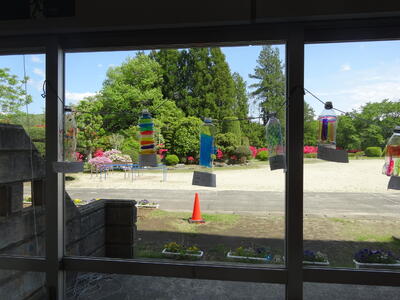 多目的ホールに2年生の作品が飾られています。まだ早いですが初夏の気分になるような作品です。