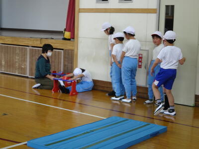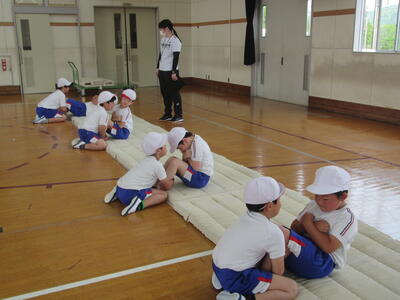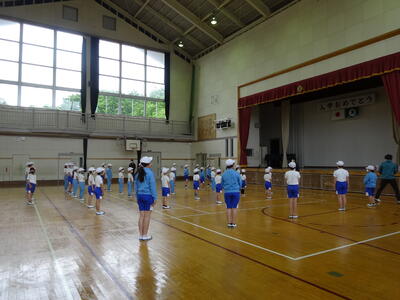 まだ小雨が降っていたので,中学年同様体育館で実施しました。
