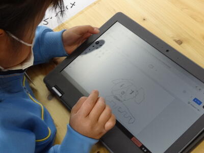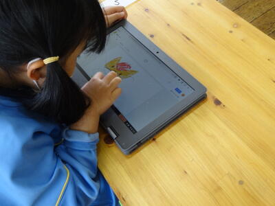 1年生が今日初めて、タブレットを使い始めました。タブレットの扱い方、使うときの約束事などの話をしっかり聞きました。今日は、お絵かきをしました。初めてとは思えないほど、すいすいと絵を描いて、色塗りまでできていました。