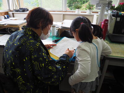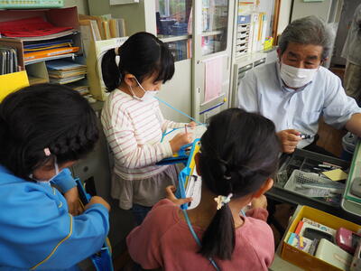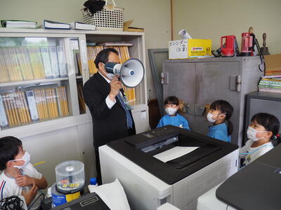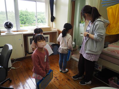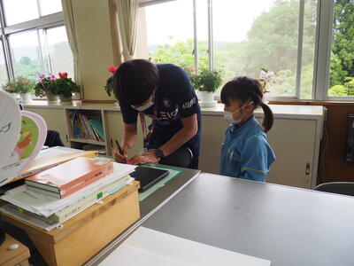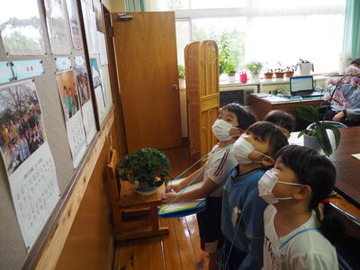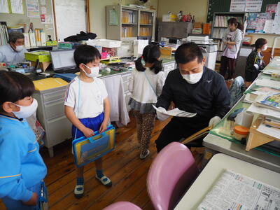 校長室や職員室、保健室などを訪れて、自作の名刺を渡して、先生にいろいろな質問をしていました。いろいろな発見ができた時間であったと思います。