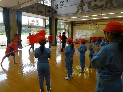 今日は,応援練習です。赤は,多目的室、白は体育館で練習しました。