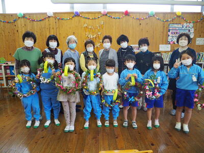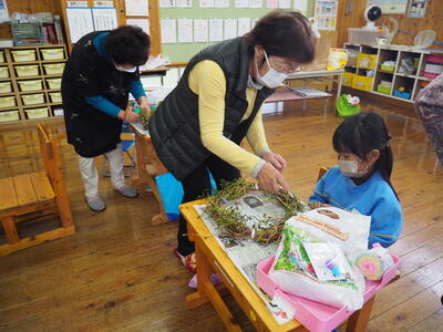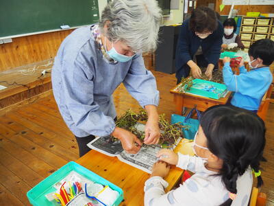 1年生の生活科で「朝顔のリースづくり」を行いました。更生保護女性会8名の皆様に御協力いただきました。